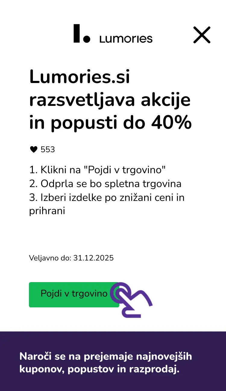 V kolikor je takšen kupon trenutno aktiven, ga lahko najdeš zgoraj. Sezonske razprodaje, kot so Black Friday, Cyber ​​​​Monday ali poletne razprodaje, prinašajo ogromne popuste, včasih vse do 70%! Poleg tega je na spletni strani Lumories.si poseben del, namenjen popustom, kjer najdeš izdelke po akcijskih cenah ali artikle iz prejšnjih kolekcij.